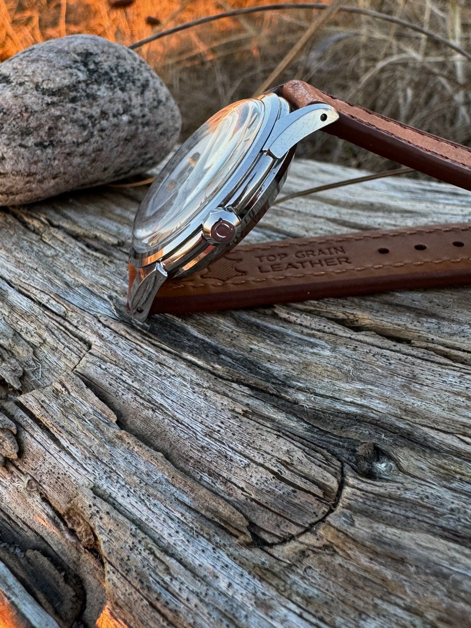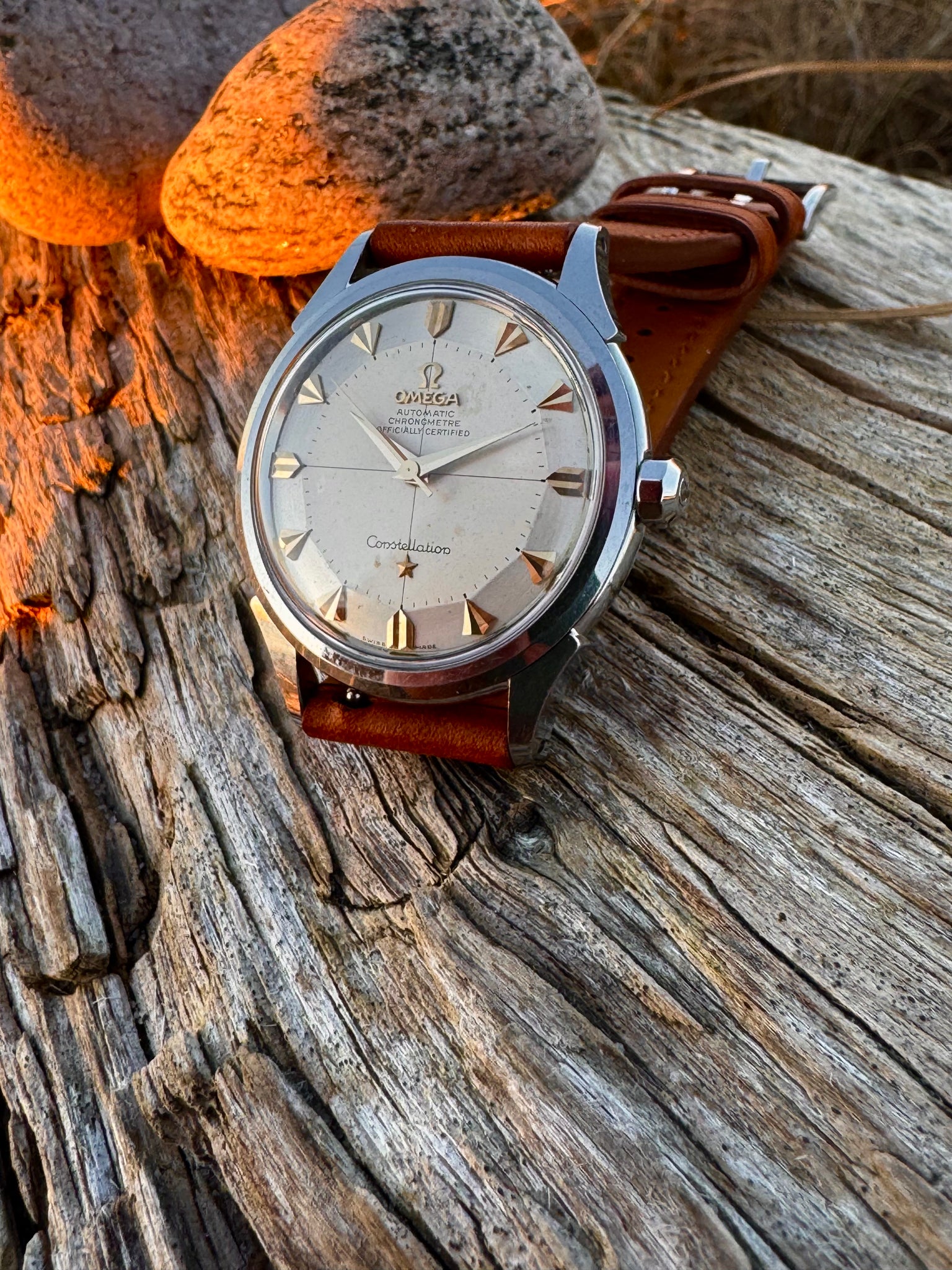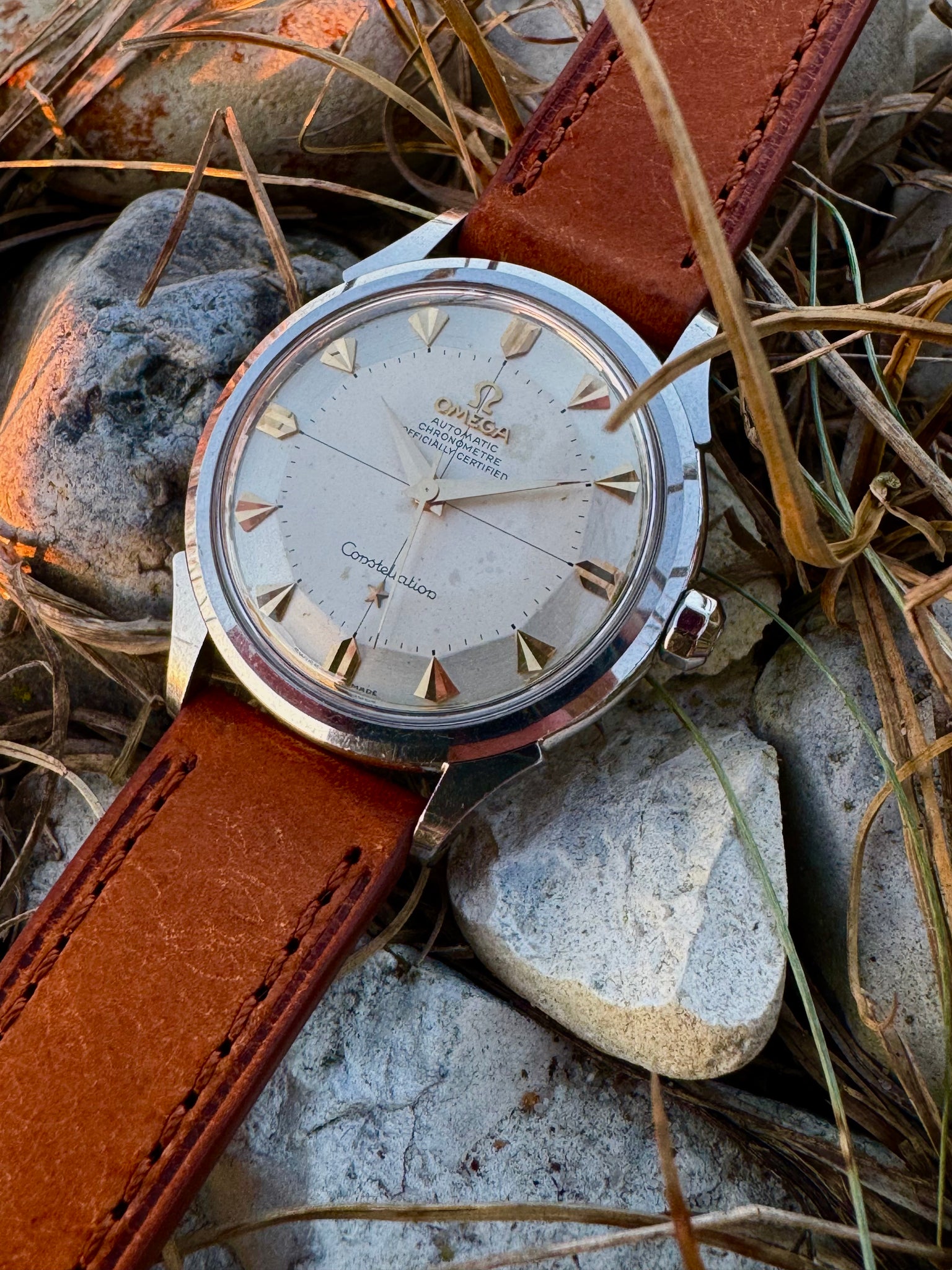 This rare vintage Omega Constellation Automatic Chronometre has a serviced caliber 505, polished, facetted, and riveted triangular (arrowhead) hour markers, polished and bevelled Dauphine hands, centre seconds with a counterweight, lyre-shaped lugs and the Observatory medallion on the pressed-on case back.