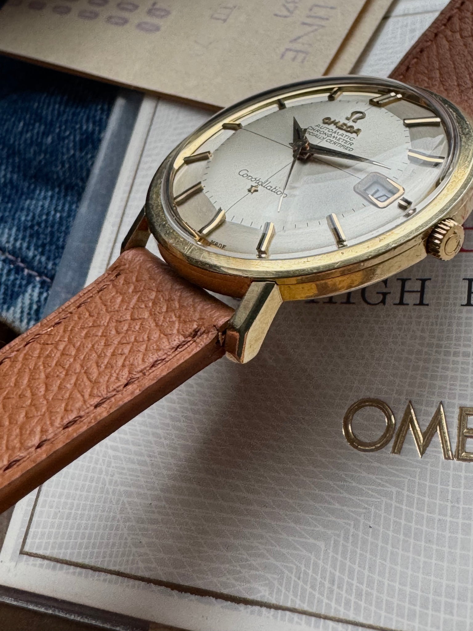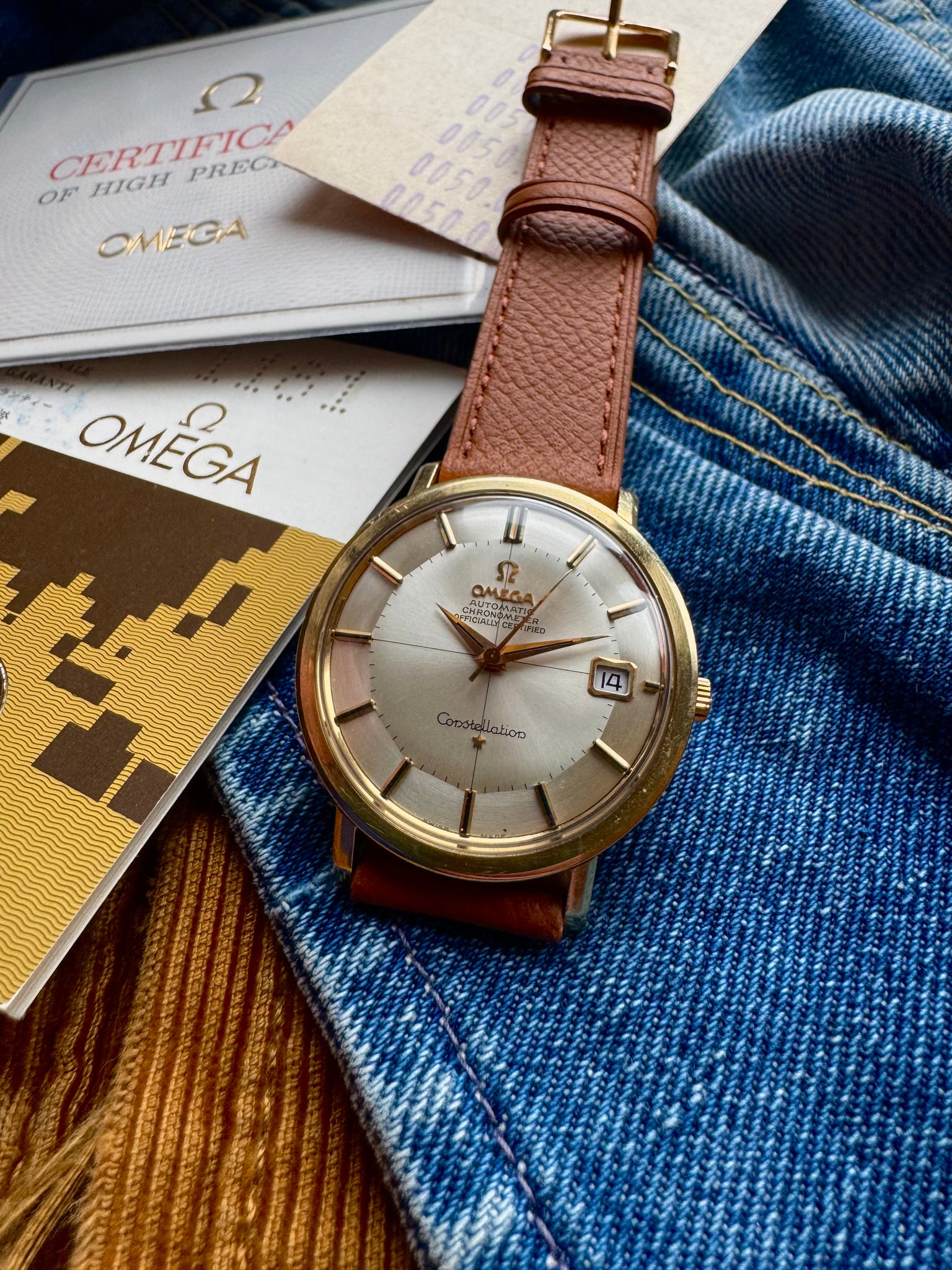 The Zenith pocket watch, with a leather-covered case designed to be worn over an outer coat, was something the daughter wished to keep. However, this fantastic Constellation watch, which Mr. Berg purchased in the 1960s, we can now offer for sale. This watch was only worn on “finer” occasions, which explains its remarkable condition. Unpolished case, fantastic dial, and all papers included.