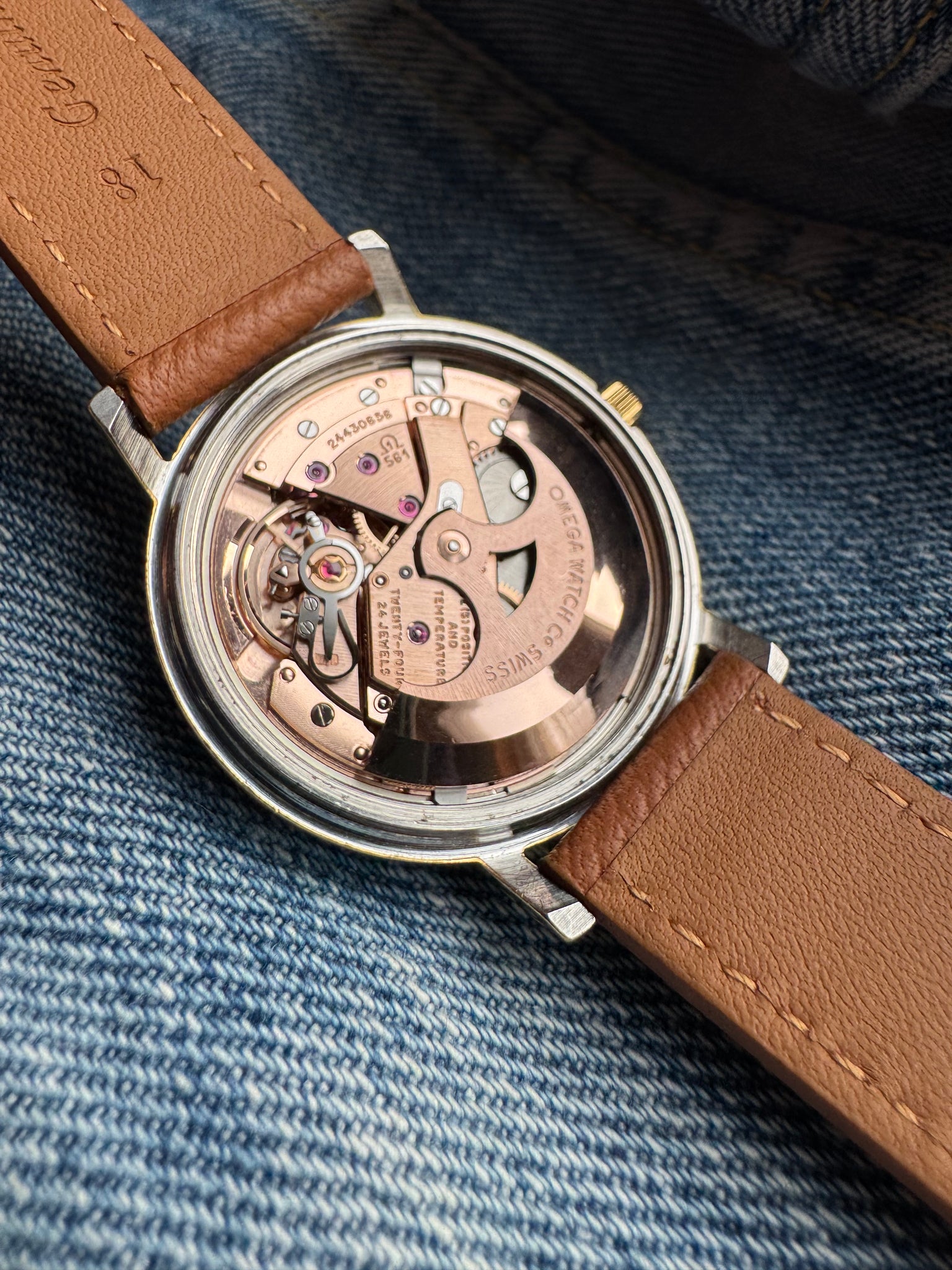 Strap/Bracelet: New premium leather strap. Original 14mm gold on steel Omega buckle is included